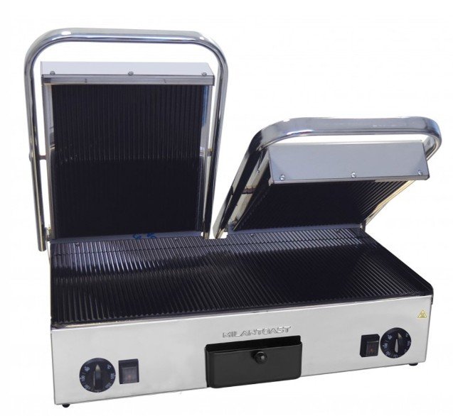 Sie ist einfach zu bedienen, mit einem Thermostat aus Edelstahl ausgestattet und eignet sich ideal zum Garen und Erhitzen von leckeren belegten Sandwiches, Toasts sowie zum Grillen von Fleisch, Fisch, Gemüse und Eiern bei hohen Temperaturen.